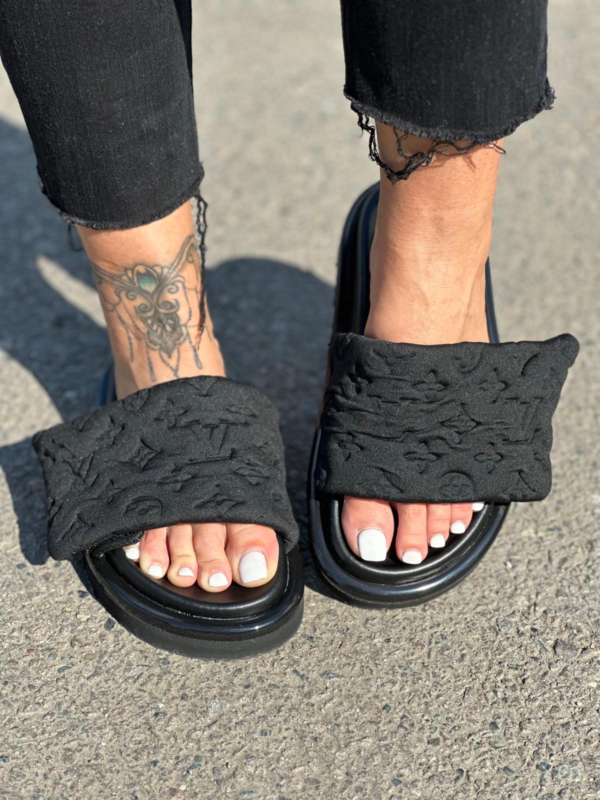 Papuci de vară unisex, moderni și comozi, realizați din materiale textile de calitate superioară. Modelul prezintă o baretă lată, matlasată, într-o nuanță elegantă de negru, cu logo-uri în relief de inspirație luxury, care adaugă un plus de stil. Talpa este groasă, ușor rotunjită, dintr-un material durabil și confortabil, ideal pentru purtări zilnice. Designul minimalist se potrivește perfect atât ținutelor casual, cât și celor streetwear.